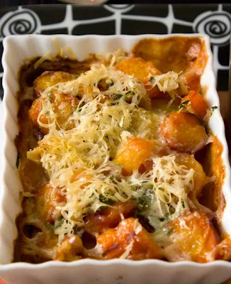Wie gesagt, Mohrrüben kaufte ich noch einmal nach – Mohrrüben werden bei mir … äh … nie lange sehr alt. Am Hermannplatz ist Freitags immer Markt und dort ist ein Stand mit Gemüse aus dem Spreewald. Die haben zur Zeit alte Mohrrüben: die gelben oder fast violetten und natürlich auch die orangen. Die sind so unglaublich lecker und schmecken nach echter Möhre! Davon kaufte ich also ein Pfund nach, schälte sie dünn, schnitt sie in Scheiben und kochte sie mit etwas Gemüsebrühewürfel und viel Salz ca. 10 Minuten vor. Dann wurden sie abgegossen, kamen in die ausgebutterten Gratinformen mit einigen zerbröselten Walnüssen sowie frischer Petersilie. Sogleich rotierte die Pfeffer- und Muskatnussmühle, streuten die Finger Salz – ich goss etwas Sahne dazu und rieb etwas frischen Parmesan darüber. Möhrengratin spielte sehr fair. Pfff … und zum Dank zickte das Soufflé!